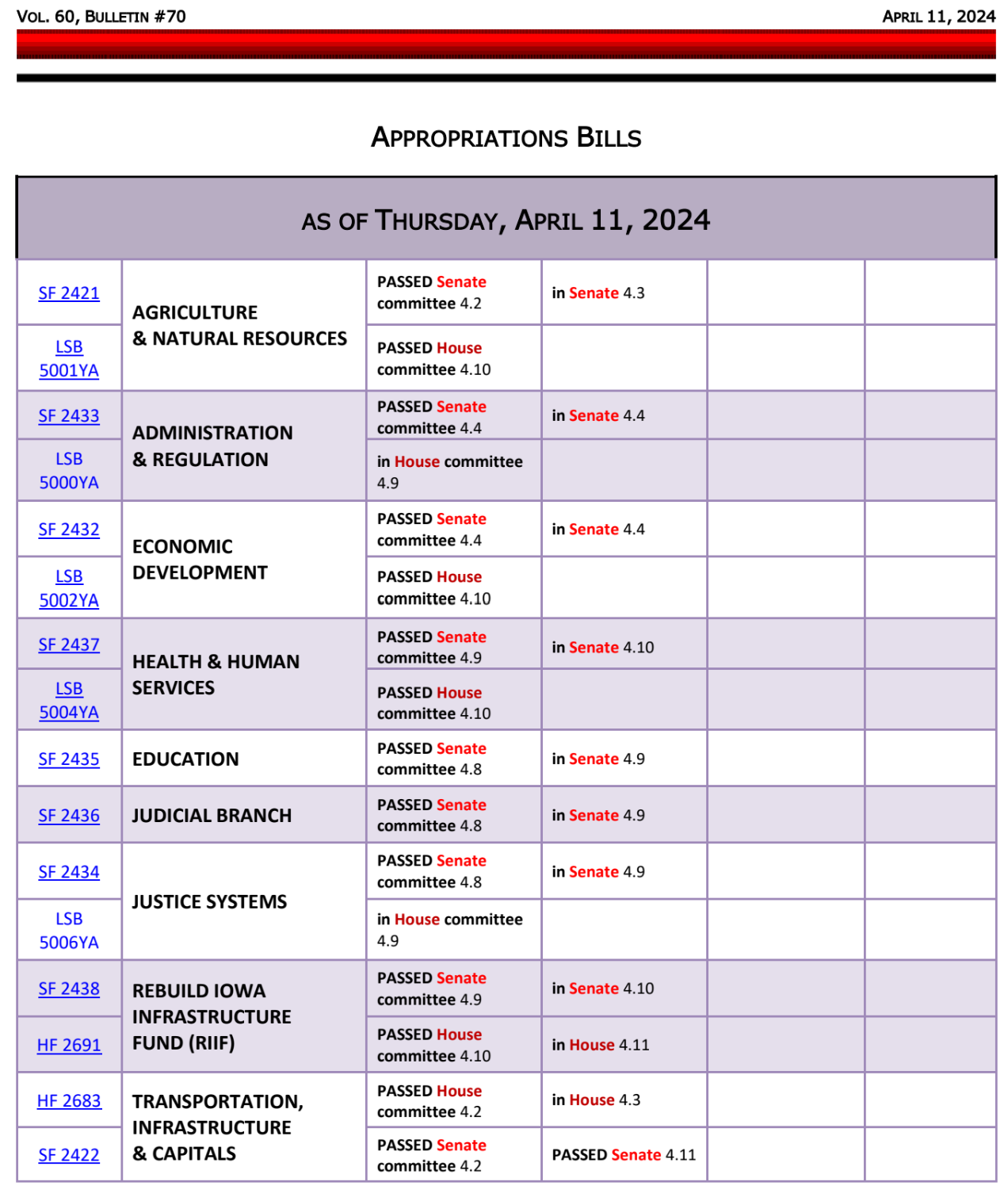 This chart from the Iowa Legislative News Service shows progress so far on appropriations bills needing to be completed in order to shut down the Session: