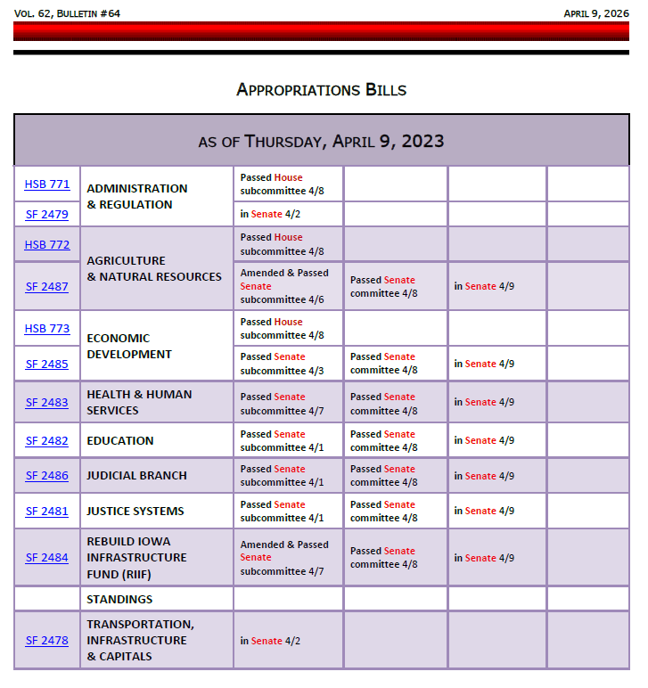 This chart from the IALNS Newsletter, April 8, shows progress on budget bills, primarily through Wednesday’s Senate Appropriations Committee. The Committee approved seven of the Governor’s Budget bills, now on the Senate Calendar. They will likely amend these bills with the Senate’s budget ideas, but may wait until the House and Senate agree on budget targets before taking further action.