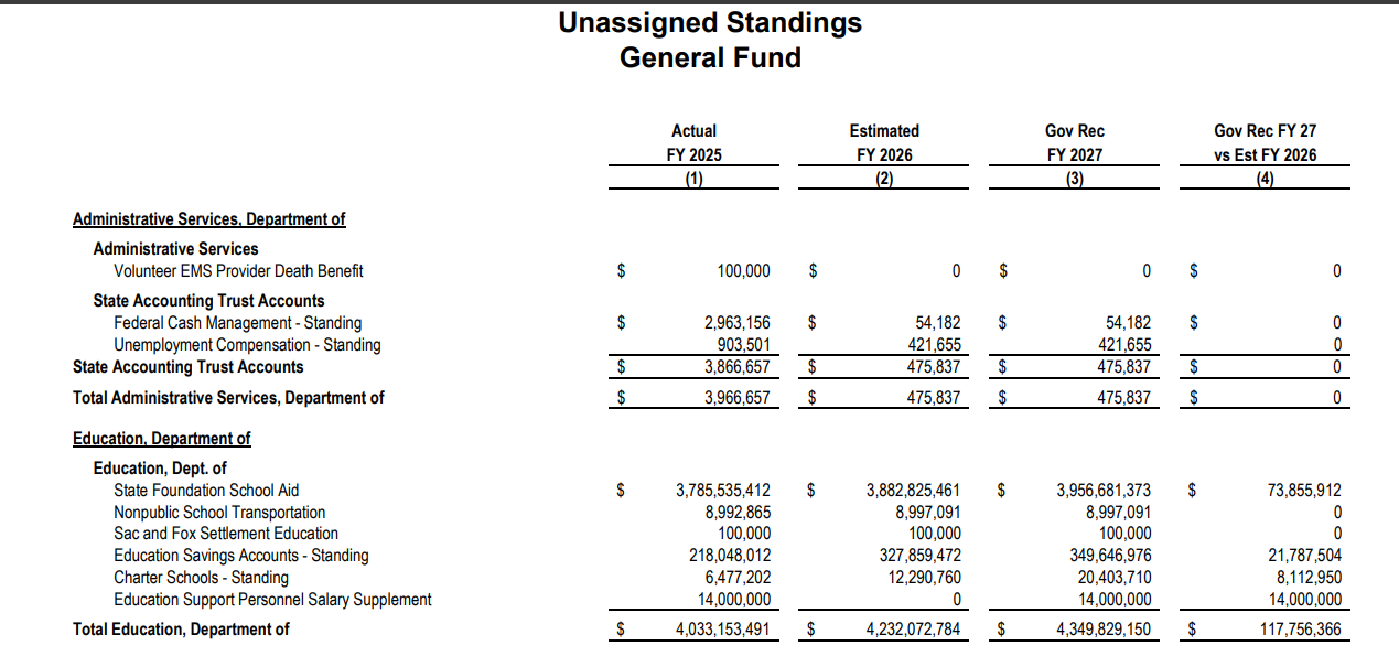 - More detail will be shared next week when the LSA Staff releases their specific Analysis of FY 2027 Governor’s Recommendations for Unassigned Standings Appropriations and Education Appropriations.